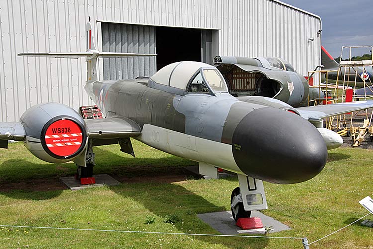 WL168 was part of the last batch of F.8s to be built by Gloster at Hucclecote and entered service with the RAF on the 22nd February 1954. For the first year it was with 111 Squadron at North Weald, then with 604 (County of Middlesex) Squadron at the same airfield, until the RAAF was disbanded in March 1957. Converted into a F(TT).8 it was used from January 1959 until September 1961 by the Armament Practice School at RAF Sylt, West Germany, to tow banner targets for shooting practice. Struck of charge on the 10th May 1962, WL168 has been a display aircraft in various markings at RAF Heywood, RAF Finningley, RAF Swinderby and RAF St Athan. From June 1988 it was the gate guard at RAF Finningley and came to the museum in May 1996. In the photograph its livery commemorates 616 (South Yorkshire) Squadron, Royal Auxiliary Air Force, and carries the markings of WK864. The genuine WK864 was delivered to the RAF on the 24th April 1953 and was sold for scrap on the 21st November 1963 at 33 MU RAF Lyneham.